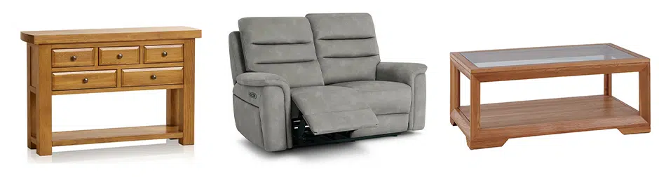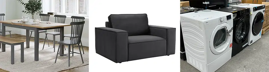 A selection of items to include sofas, chairs, tables and chairs, white goods, guitar.